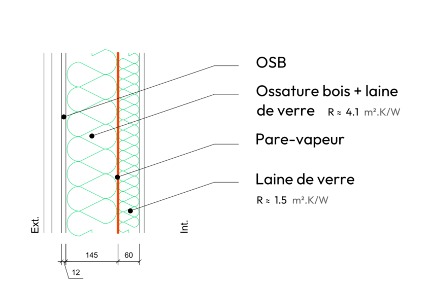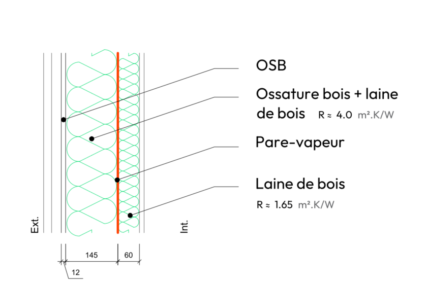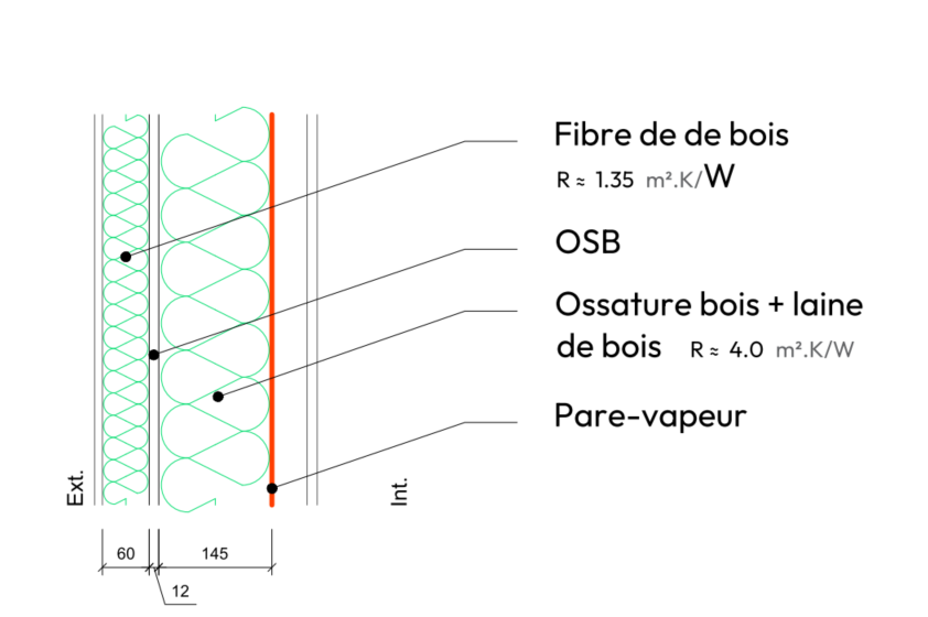 Mur ossature bois + laine de bois + fibre de bois extérieure