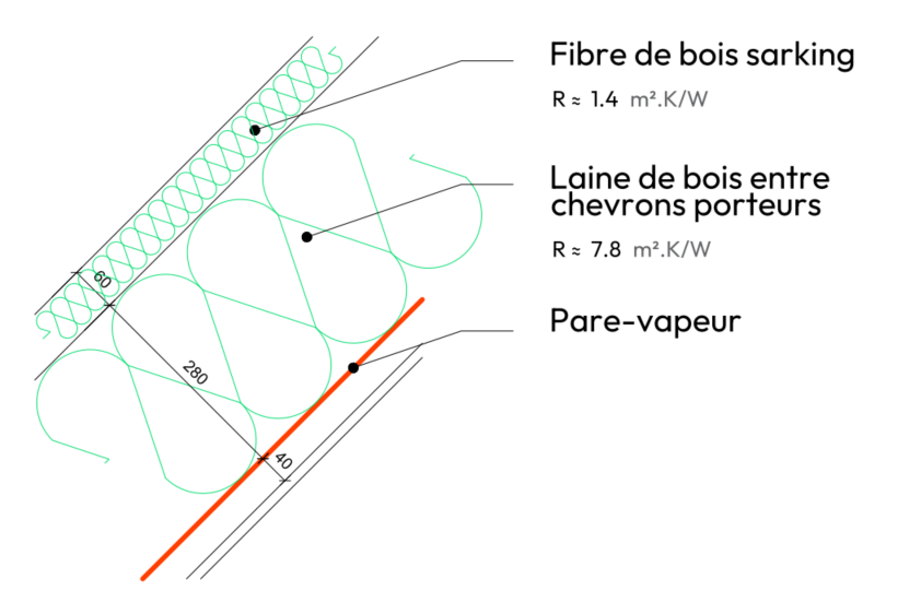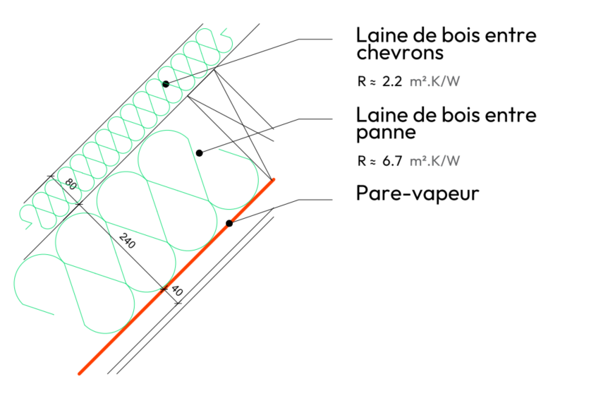 Laine de bois entre chervons porteurs + fibre de bois en sarking